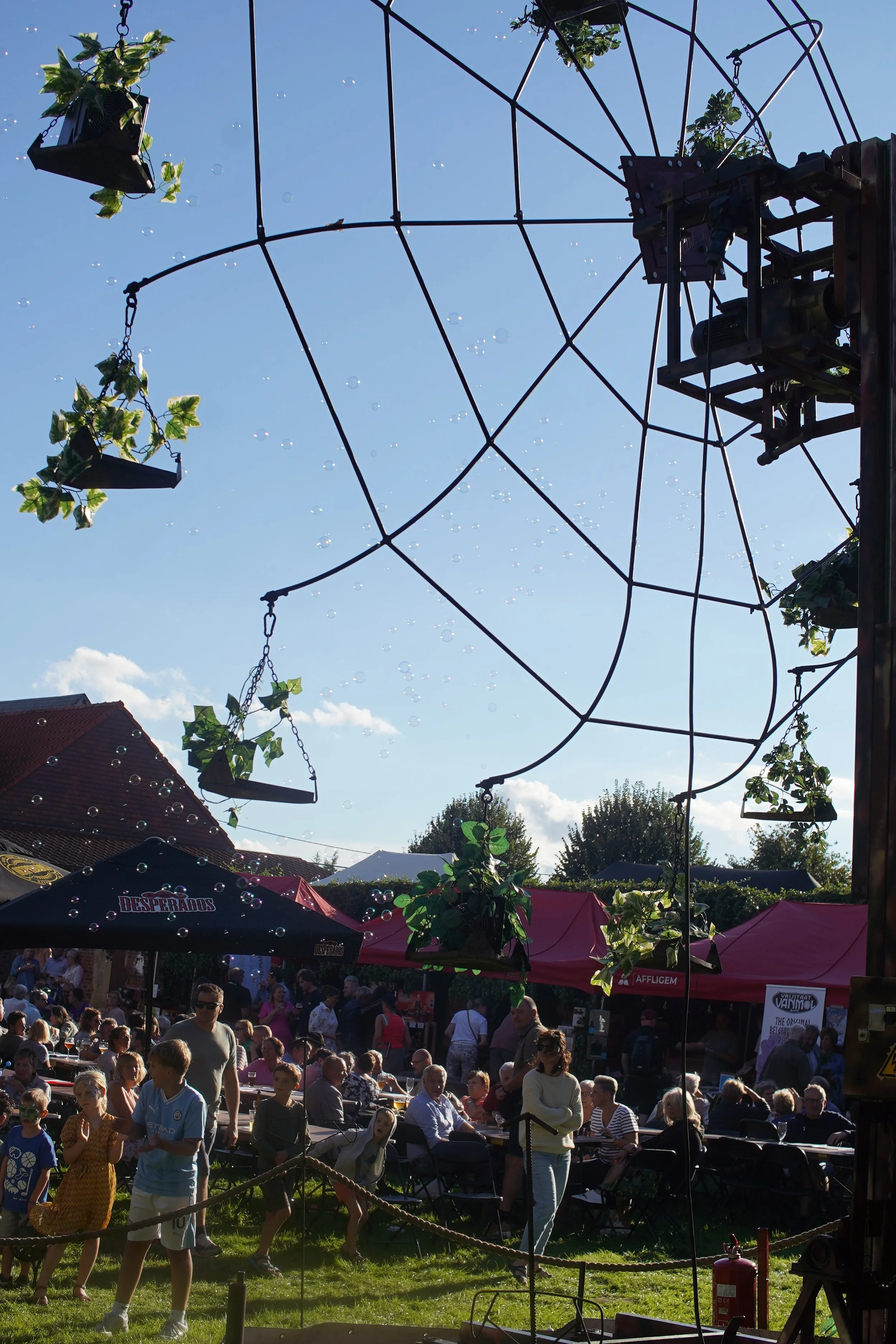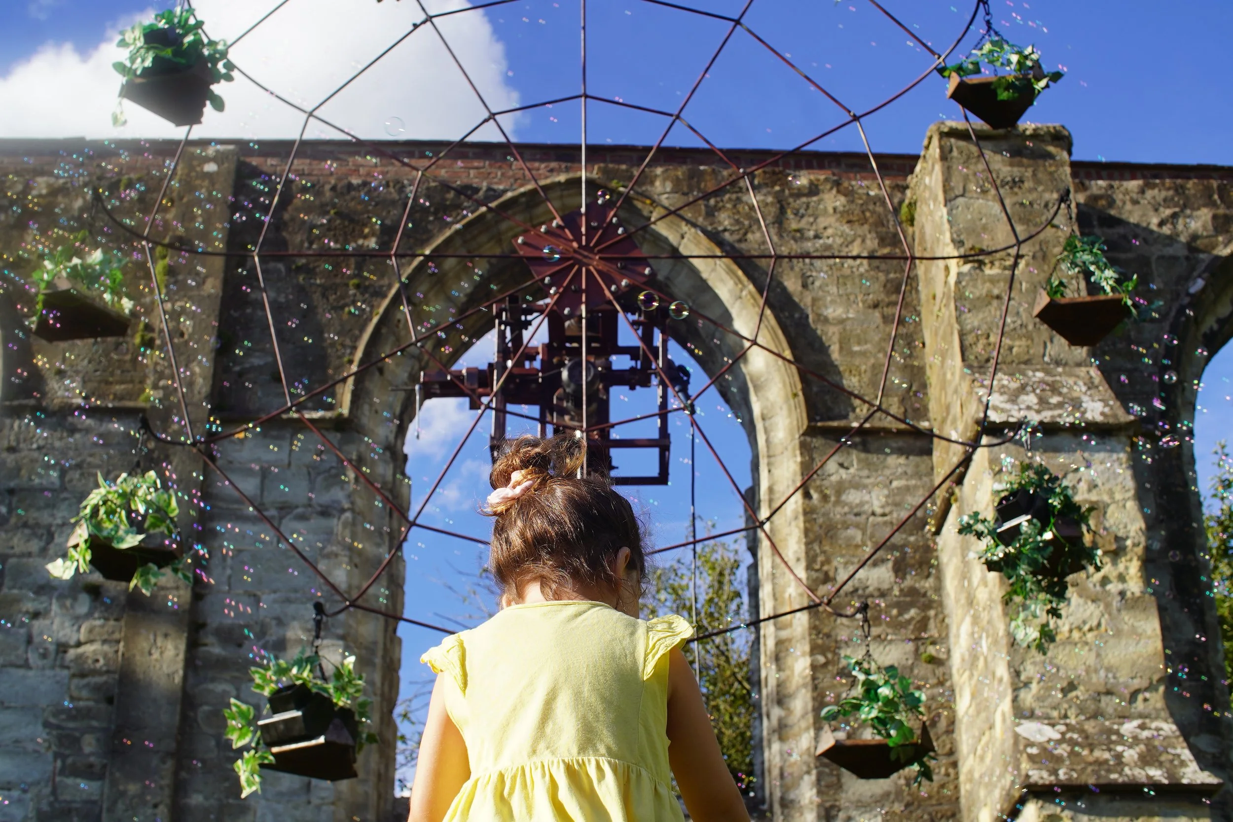 Door te trappen op de fiets zetten ze zelf het proces in gang, waarbij de lucht gevuld wordt met duizenden glinsterende bellen.